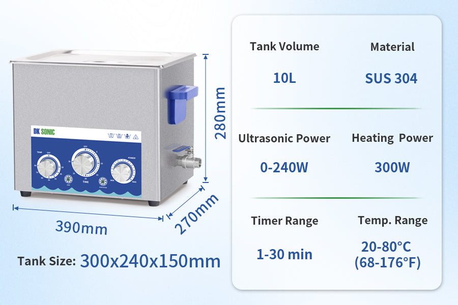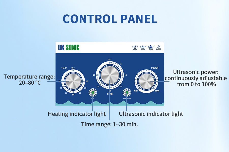 The ultrasonic power can be set as 0~100% circularly by clicking the Power Setting knob. Low power settings are suitable for cleaning delicate components such as circuit boards, whilst high power is ideal for tackling stubborn grease and oil residues.